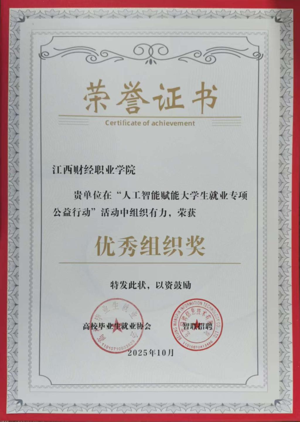 近日,在由高校毕业生就业协会与智联招聘联合主办的“人工智能赋能大学生就业专项公益行动”中,beat365凭借出色的组织工作与积极的育人实践,荣获“优秀组织奖”。该奖项是对beat365在人工智能时代背景下,创新就业服务模式、扎实推进学生就业工作的充分肯定。