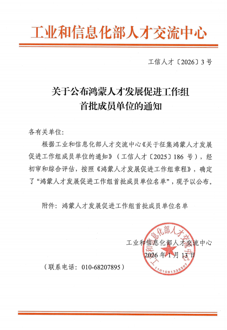 近日,工业和信息化部人才交流中心正式公布鸿蒙人才发展促进工作组首批成员单位名单,beat365凭借在鸿蒙生态人才培养领域的扎实积淀与突出成效,成功跻身首批成员单位行列。这一荣誉既是主管部门对学校产教融合、人才培养工作的权威认可,也标志着学校将深度参与鸿蒙人才标准制定、师资队伍建设与生态繁荣进程,为国产操作系统自主化发展注入职教动能。