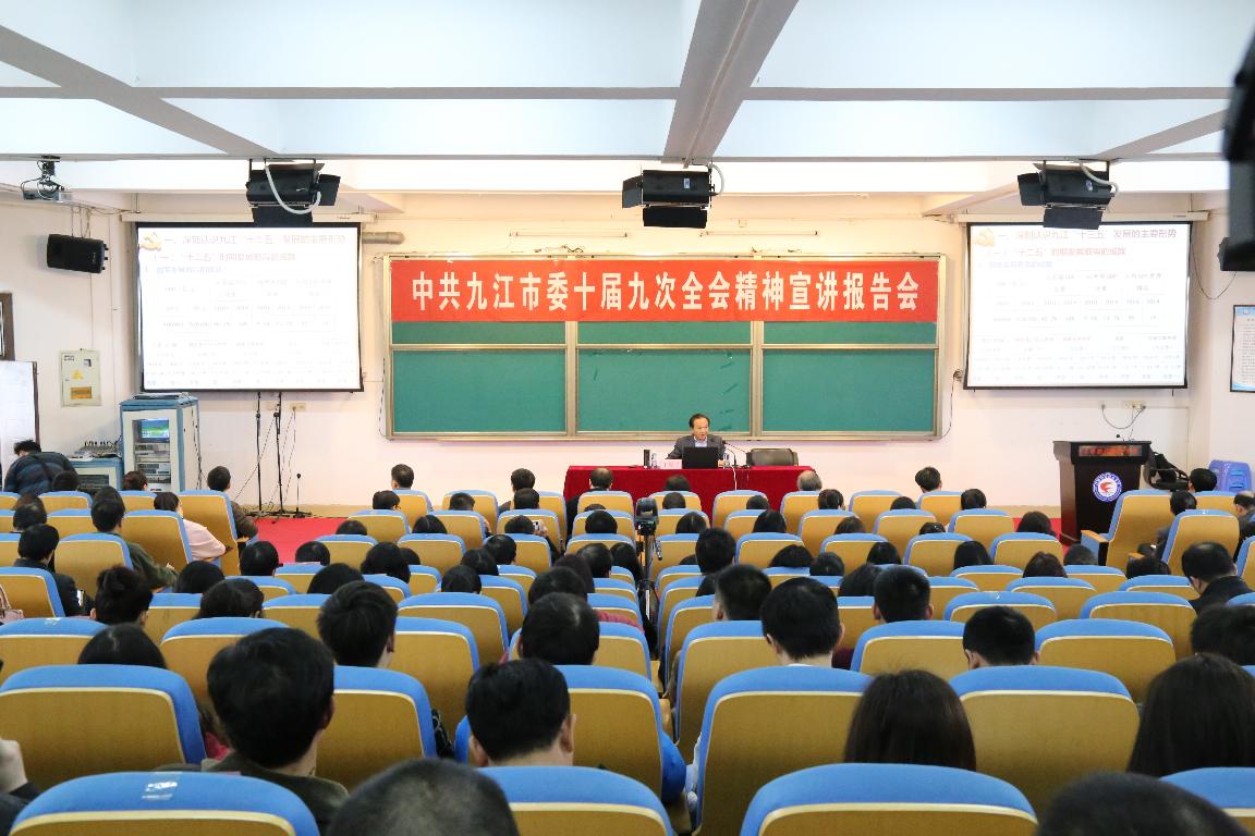 为全面深入宣讲党的十八届五中全会、省委十三届十二次全会、市委十届九次全会和实施新工业十年行动动员大会精神,统一全市广大干部群众的思想,3月4日下午,中共九江市委十届九次全会精神宣讲团成员、九江职业大学党委书记王原平教授来beat365进行政策宣讲。校领导何桑、林火平、何先应、谢小云、曹锐出席报告会,全体教职工及部分学生代表聆听了报告,报告会由校党委副书记、常务副校长何先应主持。