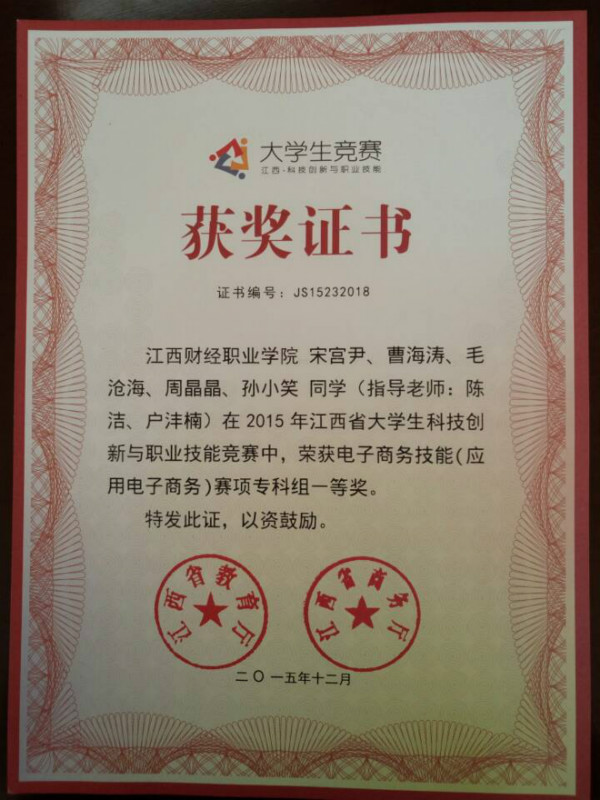2015年12月,由江西省教育厅、江西省商务厅主办,江西百吉鸟电商教育发展有限公司、江西财经大学承办的“江西省大学生电子商务应用(创业)大赛”决赛在江西高新区圆满落幕。此次江西省大学生电子商务应用创业大赛是积极响应李克强总理提出“互联网+”以及倡导“大众创业,万众创新”的政策。于2015年9月5日—11月29日举行,历时三个月,全省共有65所高校,共546团队报名参赛。beat365经济贸易学院电子商务专业5名同学组成的“拾梦”代表队喜获江西省团体一等奖(排名第一)。