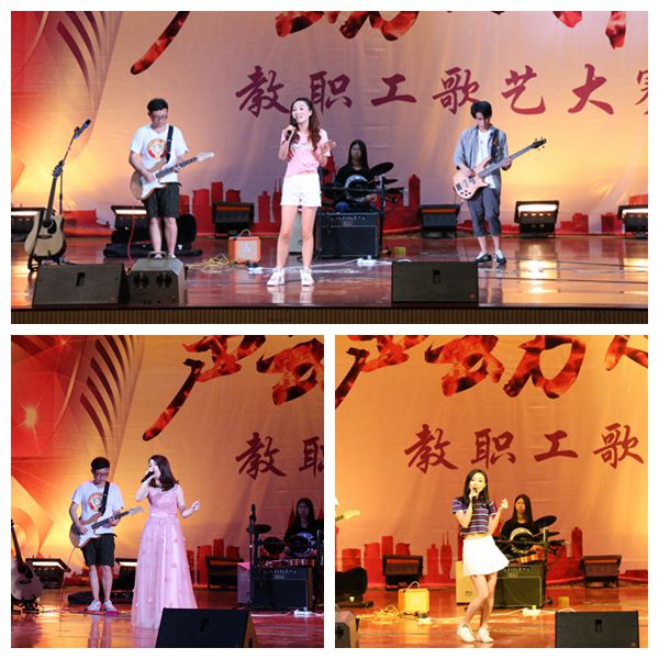 歌曲演唱结合乐队伴奏、钢琴演奏、吉他弹奏、MTV视频等多种形式,让整场比赛更像一场精彩纷呈的演唱会。台上一曲曲歌曲,或简单明快,或深情婉转,或高亢激昂,不同的唱法与演绎,同样的精彩与动听。校中青年教工代表刘素华、高小兰、杨郁、黄亮、毛嘉琪及学生组合802乐队也特别献上精彩节目,为比赛助兴。整场演出高潮迭起,台下观众掌声涌动,喝彩不断。