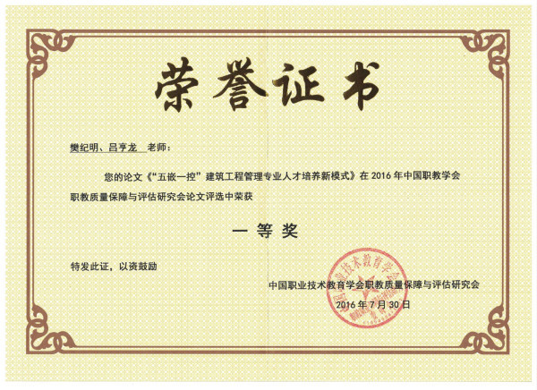 根据中国职业技术教育学会职教质量保障与评估研究委员会和教育部职业技术教育中心研究所联合发布的《关于开展“高等 职业院校质量保障优秀案例”征集活动的通知》(职教所〔2016〕 37 号)要求,在学院领导和相关部门的指导下,财税金融学院樊纪明院长、吕亨龙副院长共同撰写的典型案例《“五嵌一控”建筑工程管理专业人才培养新模式》代表学院参加评选,并获得了一等奖,展示了beat365职业教育质量保障与评估领域研究的最新进展。