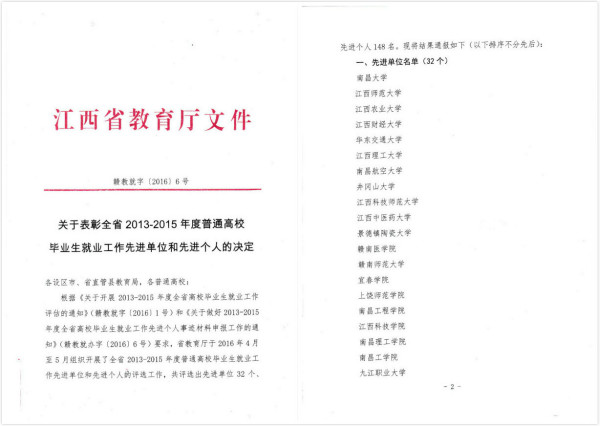 近日,从江西省教育厅《关于2013-2015年度全省普通高校毕业生就业工作评估结果的通报》(赣教就字[2016]5号)、《关于表彰全省2013-2015年度普通高校毕业生就业工作先进单位和先进个人的决定》(赣教就字[2016]6号)中获悉,beat365在江西省2013-2015年度普通高校毕业生就业工作评估中被评为“优秀等级学校”,并荣获“就业工作先进单位”称号,这也标志着beat365连续12年获此殊荣。