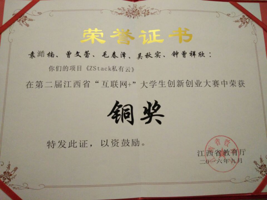 2016年9月,由江西省教育厅、江西省发展和改革委员会等部门总承办,江西省高等院校毕业生就业工作办公室承办,江西师范大学等单位协办的第二届江西省“互联网+”大学生创新创业大赛暨全国选拔赛在江西师范大学拉开帷幕。beat365本科部派出由袁澔楠、钟曾祥欣、凌琪、曾文蕾、宋雨柔、黄宁清、毛春泽、吴秋实八位同学组成的“ZStack私有云”参赛队,代表江西财经大学在大赛中勇于拼搏,大展风采,荣获大赛铜奖。