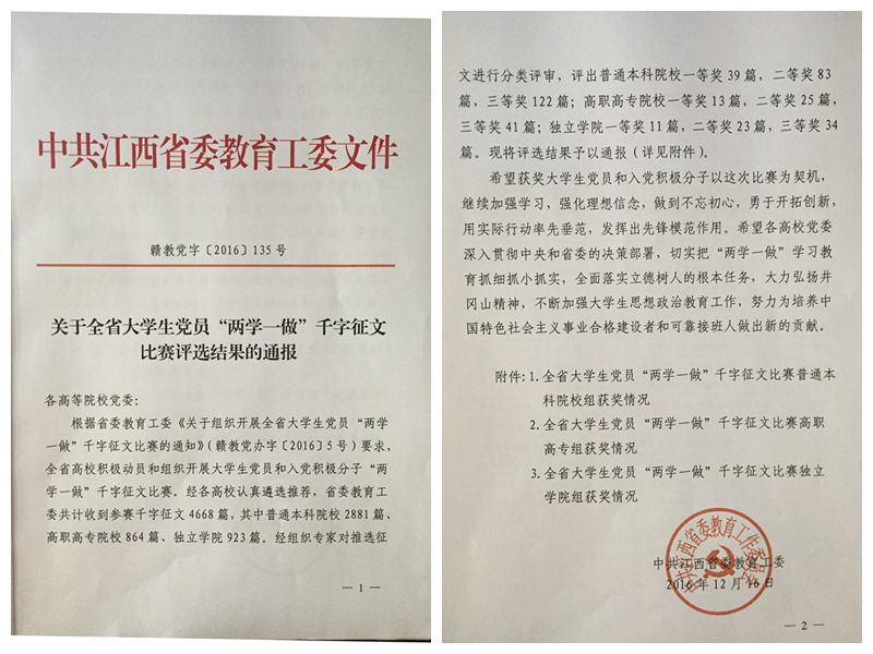 近日,全省大学生党员“两学一做”学习教育千字征文比赛评选结果揭晓,beat365在比赛中创得佳绩,经济贸易学院余裕等3名学生党员的作品均荣获高职高专组一等奖。同时,beat365也是高职高专组荣获一等奖人次最多的高职院校。