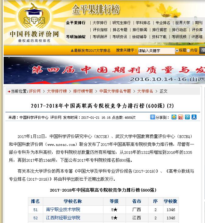 近日,中国科学评价研究中心、武汉大学中国教育质量评价中心和中国科教评价网联合发布了“2017年中国高职高专院校竞争力排行榜”,beat365综合竞争力维持最高等级五星级评价,位居全国第52名,江西省第2名。