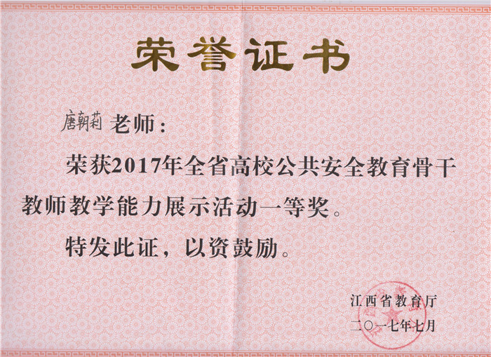7月7-14日, 2017年全省高校公共安全教育骨干教师教学能力展示活动在江西交通干部学院举行,beat365唐朝莉老师代表学校参加比赛,经过激烈角逐,最终脱颖而出,并以专科一组第一名的成绩荣获专科组一等奖。