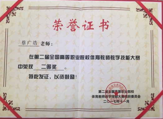 2017年11月24-25日,“第二届全国高等职业院校体育教师教学技能大赛”在江苏省苏州市职业大学举行。大赛按体能与急救、运动技术、教学设计与实践(说课与微课)3个类别进行,来自全国32个省(区、市)一百五十余所高职高专院校的251名体育教师参加了比赛。大赛成绩评定采用百分制,其中体能成绩占15%,主项成绩占30%,副项成绩占15%,教学设计与实践占40%。在体能测试中,依次要完成90秒跳绳、坐位体前屈、立定跳远和急救操作4个规定项目;在运动技术测试中,参赛教师将在大球类、小球类、健美健身类、武术类、田径类、特色类六大类14项中自行选定1主项和1副项;选手还需根据所报主项项目,在学校体育课授课计划中抽取内容进行7-8分钟教学设计与实践(说课与微课),并以视频形式提交。