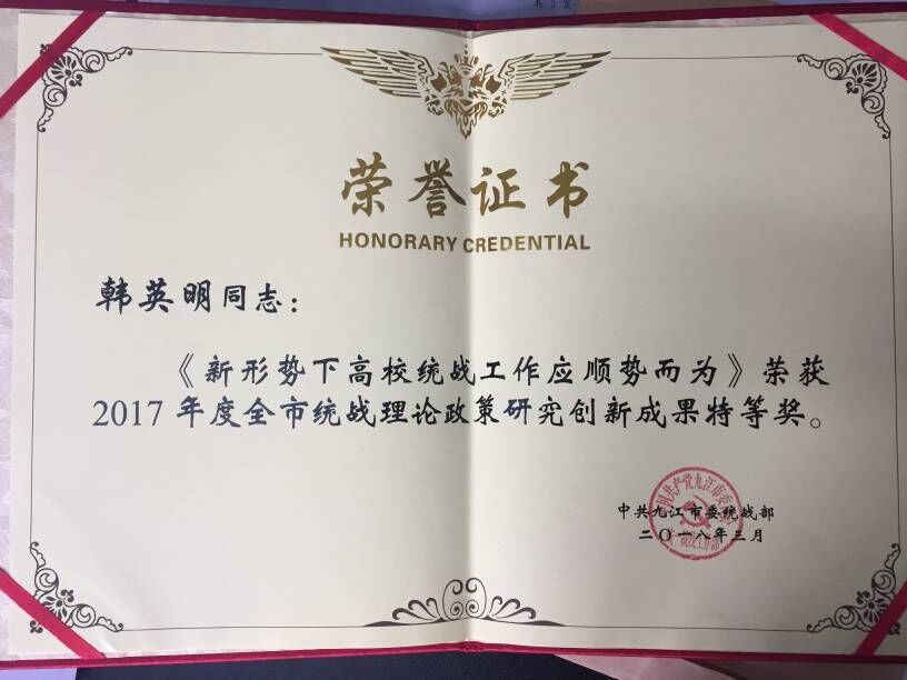 3月2日,中共九江市委统战部发文《关于2017年全市统战工作综合先进单位、工作进步奖、理论政策研究创新成果奖、统战工作实践创新成果奖获奖单位的通报》(九统字[2018]12号),beat365选送的论文《新形势下高校统战工作应顺势而为》(作者:韩英明)荣获全市统战理论政策研究创新成果特等奖。日前召开的2018年全市统战工作会议对获奖的优秀单位和个人进行了表彰。