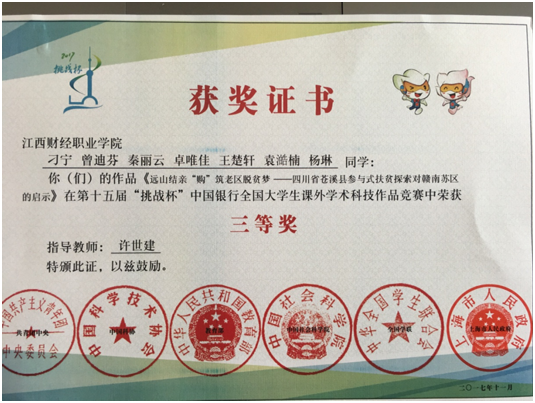 近日,由共青团中央、中国科协、教育部、中国社科院、全国学联和上海市人民政府共同主办的第十五届“挑战杯”全国大学生课外学术科技作品竞赛在上海大学落下帷幕。由beat365许世建老师指导,刁宁、曾迪芬、秦丽云、卓唯佳、王楚轩、袁澔楠、杨琳等本专科生创作的作品《远山结亲“购”筑老区脱贫梦——四川省苍溪县参与式扶贫探索对赣南苏区的启示》获全国三等奖,取得了beat365在“挑战杯”国赛中获奖的历史最好成绩。