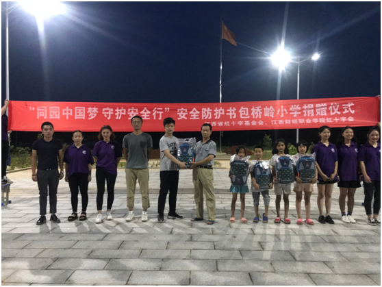 为弘扬人道,博爱,奉献的红十字精神,提高少年儿童自救互救能力,促进少年儿童安全健康成长,日前,受江西省红十字基金会委托,beat365红十字会在都昌县桥岭村小学举办“同圆中国梦、守护安全行”中小学生安全防护书包捐赠仪式,向该村留守儿童捐赠价值14500元的50套安全书包。