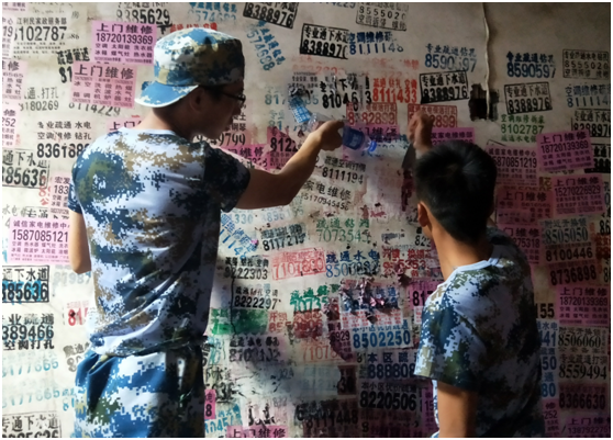 活动中,志愿者们提着水桶,拿着小铲、墙刷等一些专用工具到各自负责的区域进行清除,有的用手撕,有的用小铲子铲,有的用涂料刷。志愿者们不怕脏不怕累,用铲刀、墙刷等工具,对小区楼栋外墙、楼道及楼道扶手上的小广告进行了清理,对粘贴牢固不易清理的小广告,志愿者们用手一点一点将其撕离墙体,对喷涂式的小广告用涂料进行覆盖。经过志愿者们的努力,社区的乱张贴现象有了明显的改善。