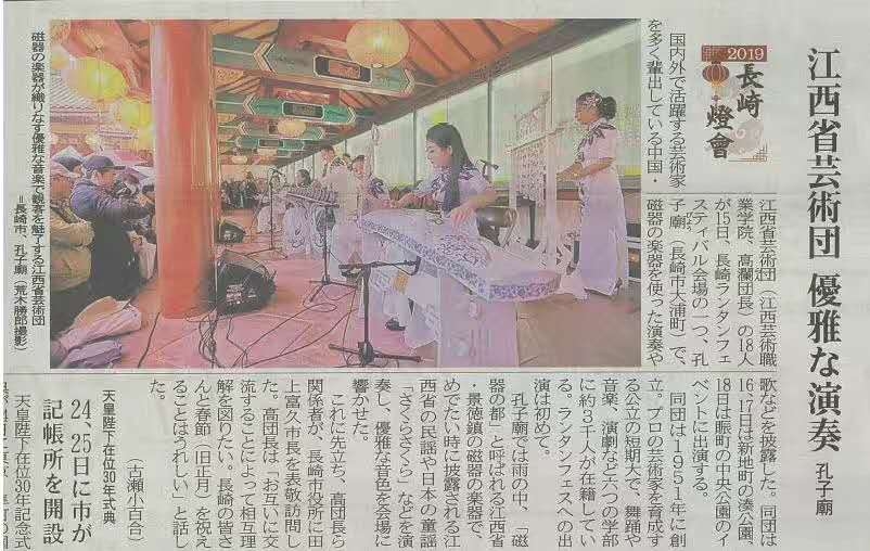 “长崎春节灯会”由长崎市与华侨联合举办,是日本为庆祝中华民族春节这一传统节日而举办的最盛大春节庆典活动,也是在日本欣赏中国文化、感受中国年味的代表性活动之一。访日期间,江西省艺术团进行了四场演出。整台演出时长60分钟,节目融音乐、舞蹈、戏曲为一体,内容丰富、形式多样、精彩纷呈,充分展示了江西独特的文化魅力,反响热烈。