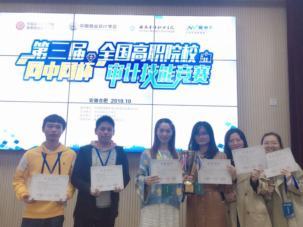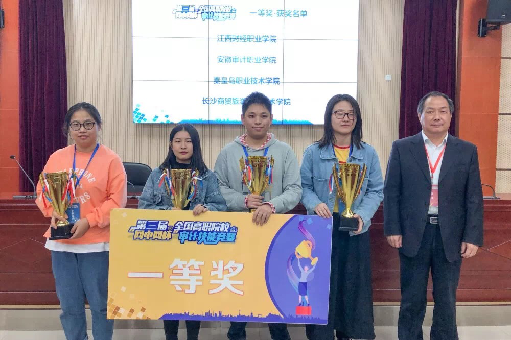 2019年10月26日,由中国高等教育学会高等财经教育分会主办、安徽审计职业学院承办的2019年第三届全国高职院校“网中网杯”审计技能竞赛在安徽审计职业学院举行。来自全国各地的35支代表队参加了本次赛事。beat365平台唯一官网会计第二学院由吴菁菁、黄迎两位指导老师带领着王璐瑶、付泽岩、汪冰琪、郑旺亚四位同学参赛。经过激烈的角逐,beat365代表队在比赛中脱颖而出,以总分637.65分的优异成绩位列全国第一,荣获一等奖,吴菁菁、黄迎两位老师荣获“优秀指导教师”称号。其中,审计理论单项比赛全国140名选手仅有13名成绩达到80分以上,beat365四位同学均位列其中,王璐瑶同学高达89分;不仅如此,付泽岩同学在审计实务单项比赛中以90分的优异成绩位列全国第一。
