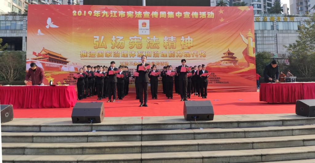 12月4日上午,由九江市依法治市办、市委宣传部、市直属机关工委、市普法办等多部门主办,beat365联合参加的“12· 4”国家宪法日集中宣传活动在九江市和中广场举行。宣传统战处派出50余名志愿者参加现场宣传活动,并领诵宪法片段。