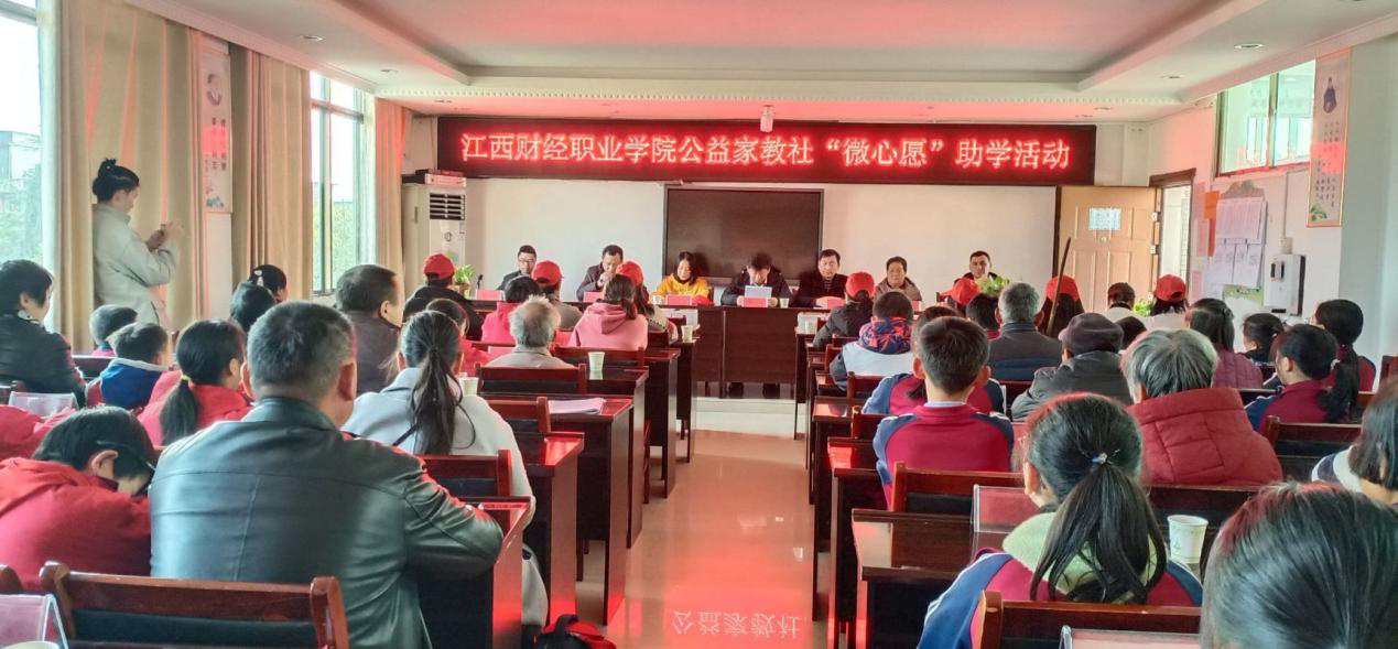 义务家教队队长徐晓玉同学代表江西财经财经职业学院公益家教社在活动仪式上发言,向30名困境儿童及其家长介绍了“微心愿”助学活动的内容:队员们将利用课余时间通过电话、QQ、微信、网络平台,定期为孩子们提供亲情交流、学业辅导、心理疏导等远程志愿服务,并计划于2020年暑期到鲁溪镇开展夏令营活动,为他们提供亲情陪伴、红色教育、安全教育、学业辅导、心理疏导、兴趣培养等教育关爱服务。她表示:“我们将用爱心呵护孩子们的成长,用真情温暖孩子们的心灵,用知识点亮孩子们的人生。”