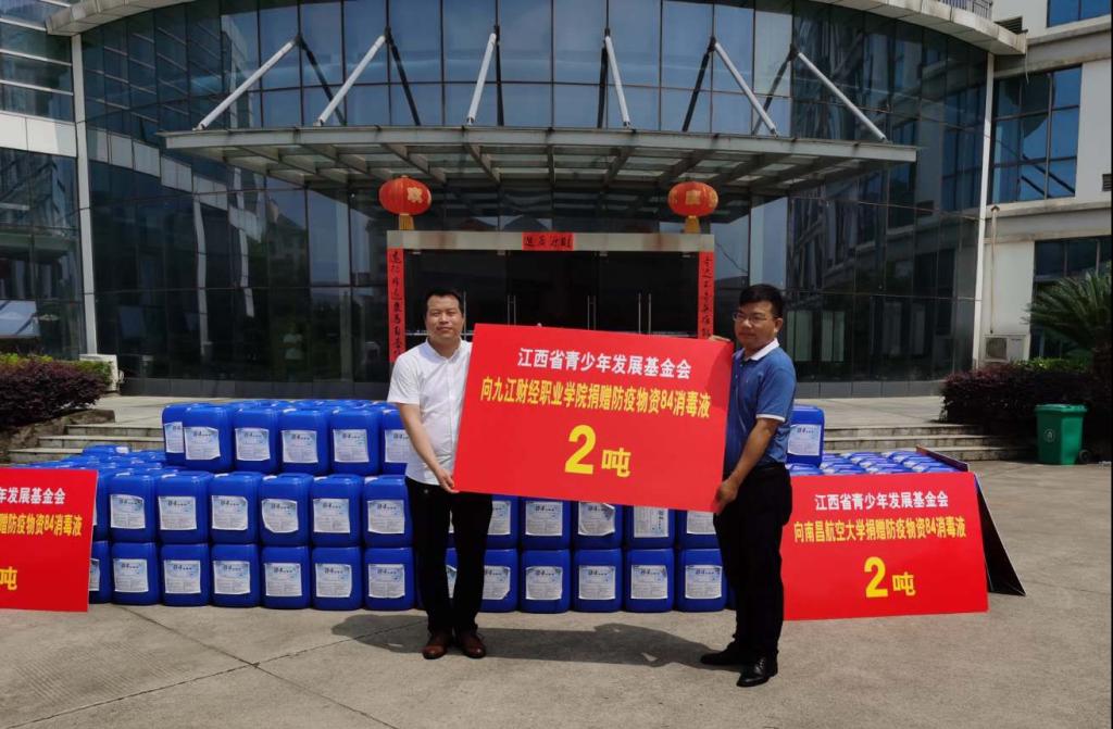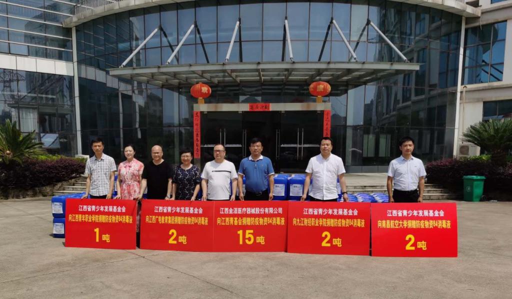 5月17日上午,在江西金洹医疗器械有限公司厂部举行了捐赠仪式。由江西金洹医疗器械有限公司向江西省青少年发展基金会捐赠防疫物资84消毒液15吨,江西省青少年发展基金会现场向南昌航空大学、江西青年职业学院、beat365平台唯一官网、江西广电教育集团等院校转捐1至2吨不等的84消毒液,其中我校接受捐赠84消毒液2吨。