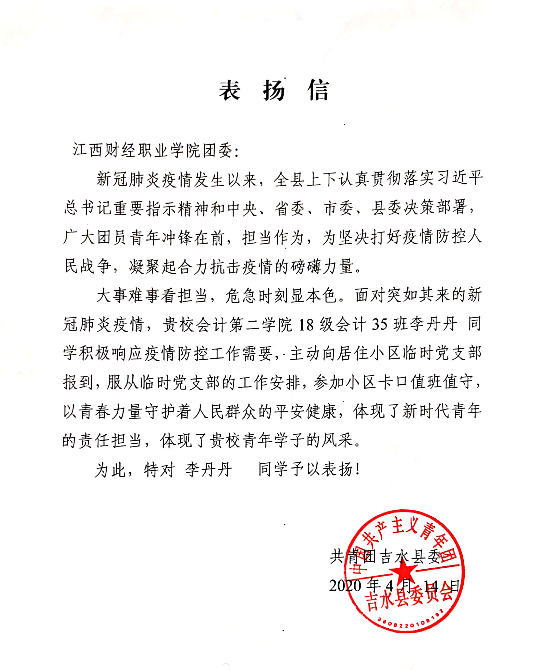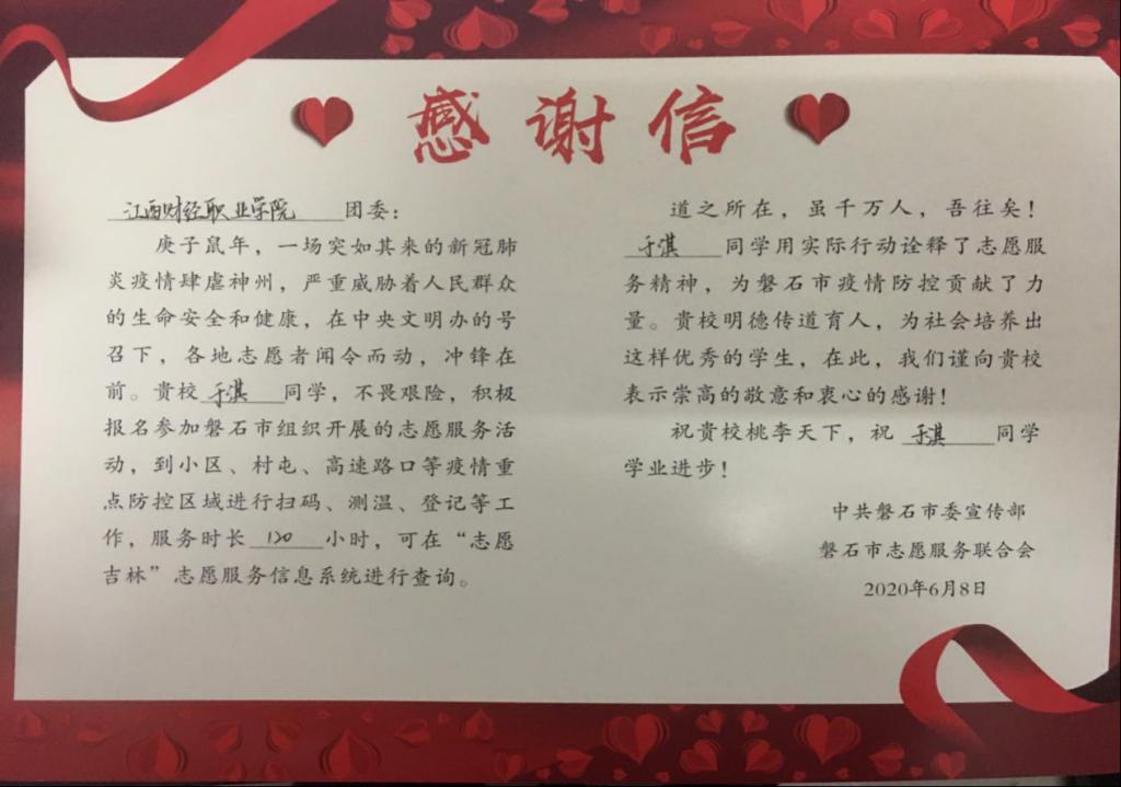 疫情发生以来,beat365收到中共磐石市委宣传部、共青团瑞昌市委、共青团都昌县委、共青团吉水县委、新巴尔虎左旗农牧业科技执法大队等地发来的感谢信、致谢函和表扬信。信中对beat365学工处江川老师、会计第一学院于淇同学、会计第二学院李丹丹同学、信息工程学院杨福灵同学、财税金融学院苏晨同学等青年志愿者积极主动加入疫情防控志愿服务队伍,为当地疫情防控工作贡献青春力量提出了感谢和表扬,并对beat365立德树人、人才培养建设的高度给予肯定。