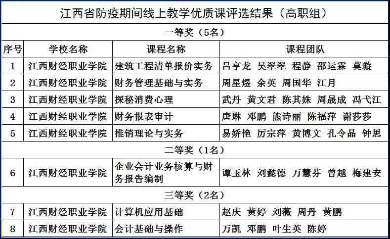 日前,从江西省教育厅网站传来喜讯,在“全省教育系统防疫期间线上教学优质课评选”活动中,beat365喜获丰收,推荐的课程共有8门获奖,其中一等奖5门,二等奖1门,三等奖2门,一等奖和获奖总数均位列全省高职院校首位。