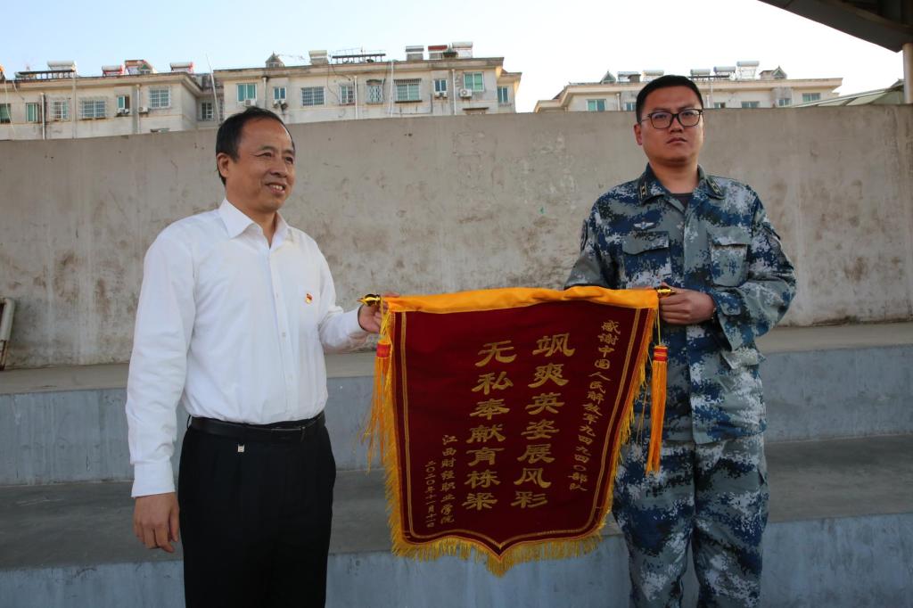 阅兵式后,林火平代表学校向中国人民解放军空军某部赠送了锦旗,感谢部队对beat365军训工作的大力支持。校领导和部队首长还为军训优胜队伍颁发了锦旗。