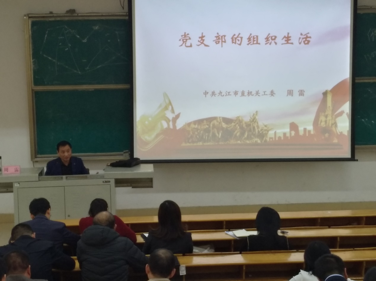 九江市直机关工委组织部周雷部长在主题为《党支部的组织生活》的讲座中,简要介绍了党的组织生活的概念、主要形式及重要意义,详细阐述了“三会一课”、民主评议党员、主题党日活动、谈心谈话、民主生活会与组织生活会等党的组织生活的目的、具体要求及组织流程。