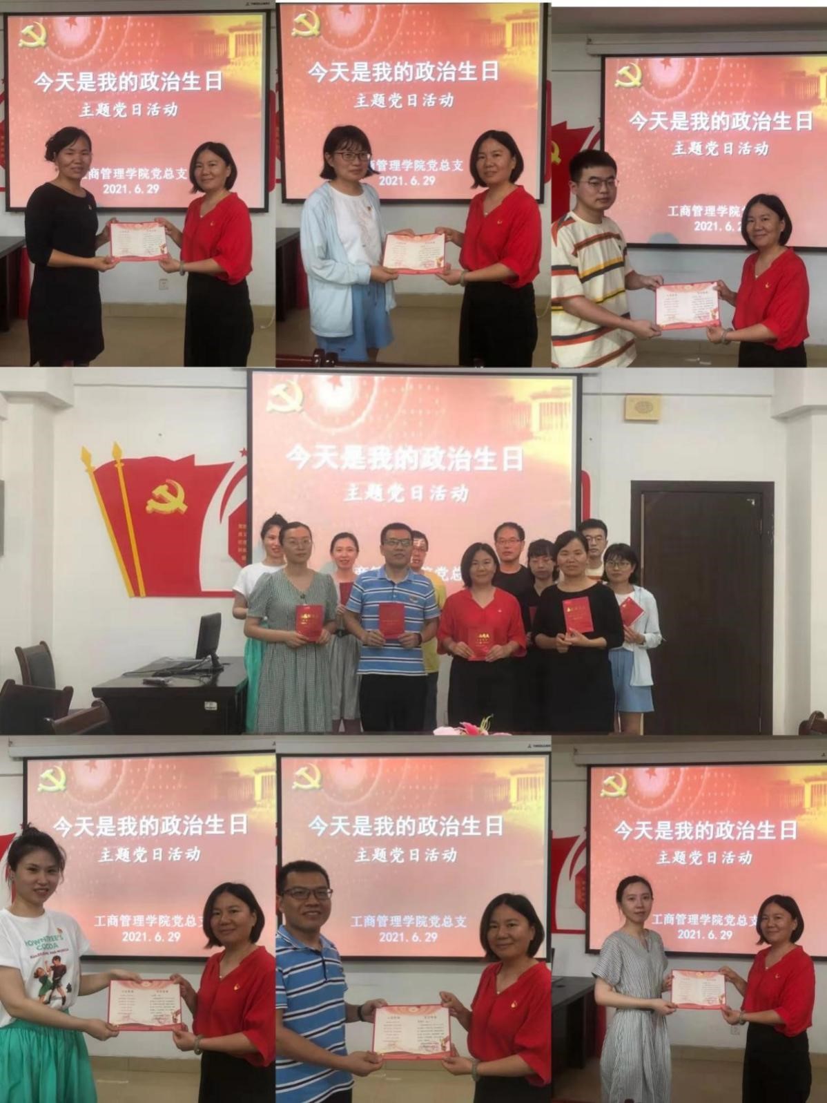 为强化党员身份认同,激发党员的党性情怀和担当意识,引导党员教师不忘入党初心,牢记立德树人的使命,体现党组织对党员的关心关爱。6月29日下午,工商管理学院党总支在综合楼903会议室开展了“今天是我的政治生日”主题党日活动,为六名上半年入党的同志集体过“政治生日”。活动由学院党总支书记武丹主持,总支全体教师党员参加。