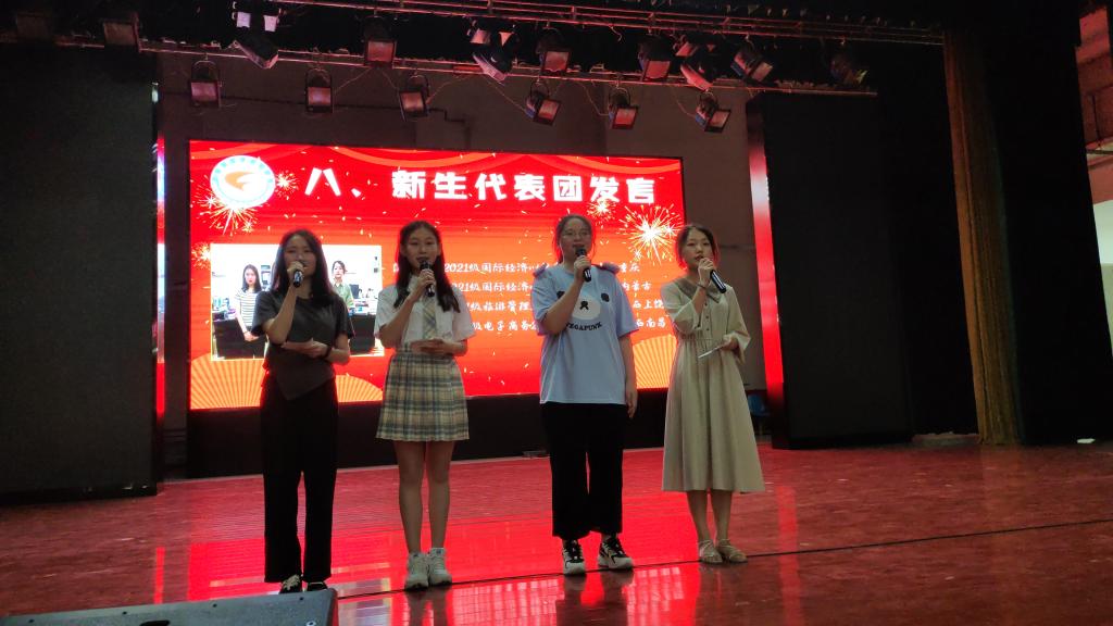 2021级新生代表团讲话,表达了新入校的激动之情,对老师、学长学姐细心关爱的感激之情,对美丽校园的喜爱之情,和对学院文化、专业实力的信赖之心。并代表2021级全体新生宣誓承诺:一定严守校纪校规、勤奋刻苦学习、讲究文明礼貌、团结合作互助,要做一个有理想、有道德、有文化、有纪律的经贸人!