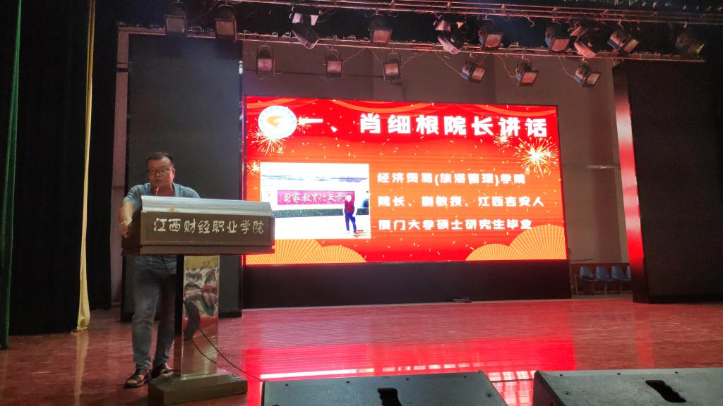 肖细根院长首先代表学院致欢迎词,肖院长介绍了从历史成就和文化底蕴等方面介绍了学校的基本情况,并从专业建设、课程培育、师资力量等方面介绍了经济贸易(旅游管理)学院的基本情况及高质量教学服务的保障,并祝愿同学们通过三年的学习收获锻炼自己,成为一个做身心健康、知行合一、敢为人先的“财院人”。
