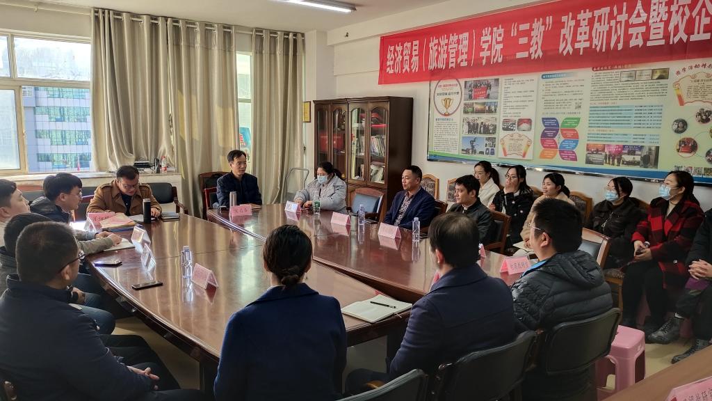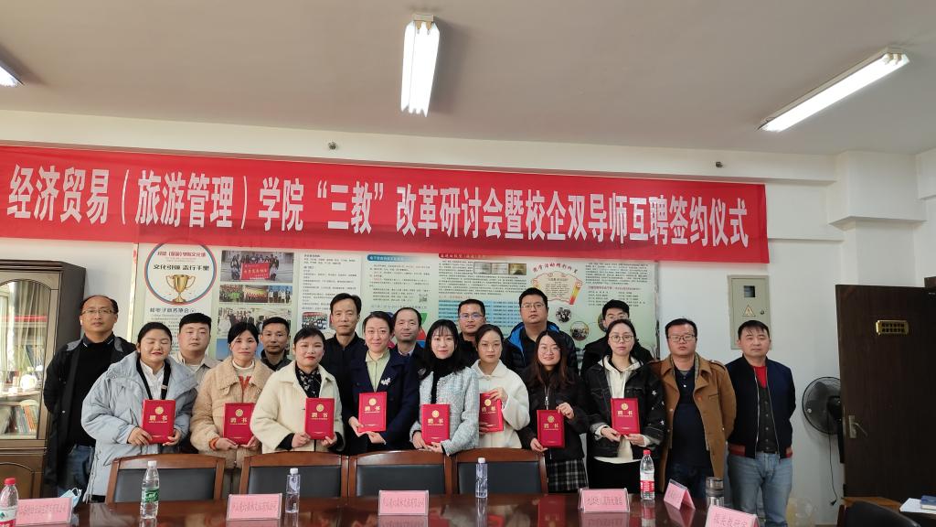 为深化教学改革,在教育部学徒制试点的基础上,拓展beat365其他专业现代学徒制试点及校企互聘双导师教学团队建设,经济贸易学院于11月23日,在综合楼804举行“三教改革”系列活动暨校企互兼互聘仪式,经济贸易学院党政领导及相关教师、合作企业代表、兄弟院校代表参加了此次仪式。