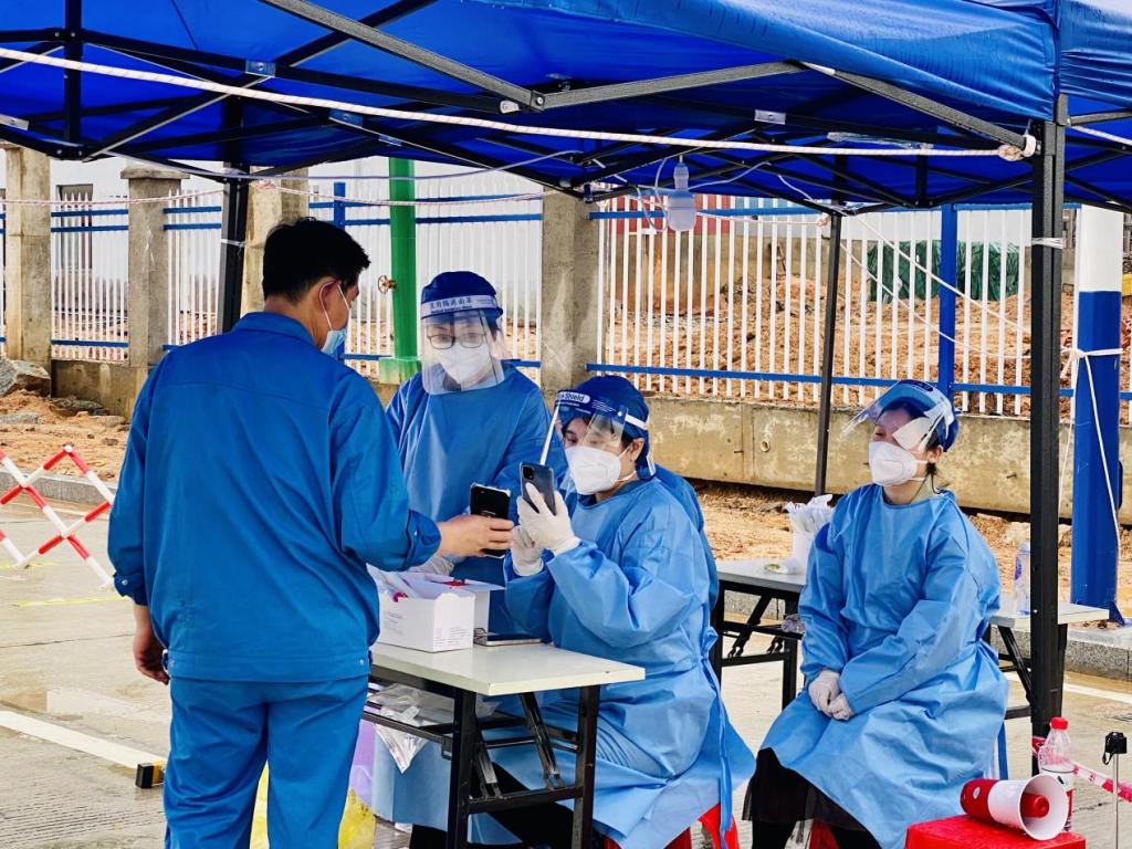 图为连菲在抗疫一线做信息登记员扫核酸检测码登记