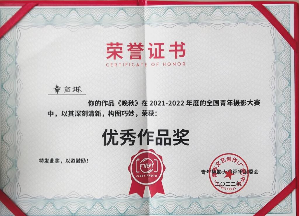 城乡建设学院2021届工程造价专业校友章宝琳,在 “2021-2022年度全国青年摄影大赛”中喜获“全国青年摄影大赛优秀作品奖”,该赛事由青年文艺创作(广州)中心举办。