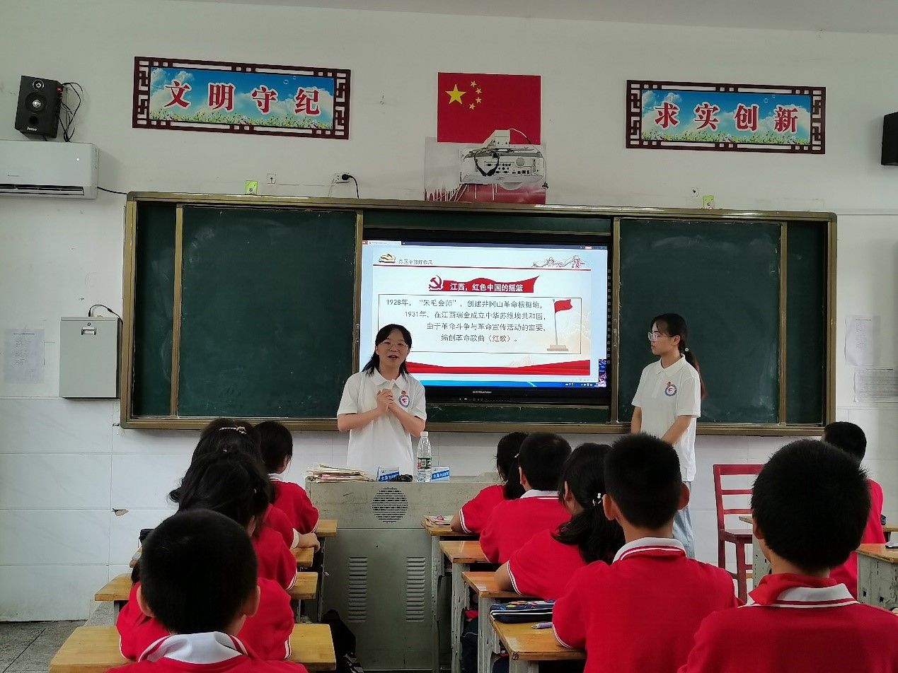 “青春心向党 建功新时代”,为传递爱党爱国爱社会主义热情,青春筑梦社会实践队在高丰镇中心小学给五年级(2)班的小朋友上一堂《苏区干部好作风》的微团课。队员结合小学生年龄实际,以视频和幻灯片的形式,通过形象生动的语言向小学生讲解苏区精神。课上介绍了《苏区干部好作风》歌词意思,队员一字一句的领唱教唱课堂气氛逐渐活跃起来,小朋友积极参与,通过红歌主动学习红色革命精神。队员通过此次微团课进一步引导小朋友们对党和国家的认识,传承红色基因、赓续红色血脉,为实现中华民族伟大复兴中国梦谱写新的篇章!