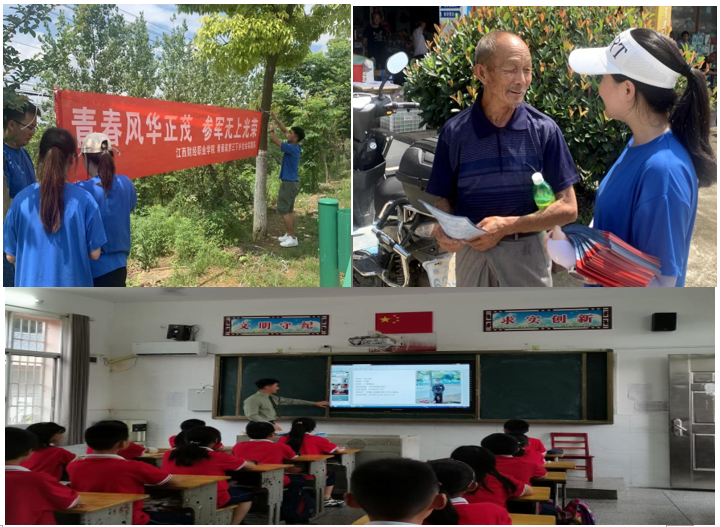 “国无防不立,民无兵不安”,为更好地宣传征兵入伍工作,社会实践队赴瑞昌市高丰镇乐丰村村民服务中心,为村民宣讲征兵政策。在讲解中乡亲们对队员说:一人当兵全家光荣,保家卫国才是英雄本色。当日下午,队伍中的退役大学生士兵在高丰中心小学给五年级的同学上了一堂“军事教育理论课”,通过阅兵式视频向小学生展现我们国家强大的军事实力,让小朋友们领悟了中国人民解放军对保家卫国的重要性,并结合服役经历分享自己参军入伍的部队生活,也希望小朋友从小“树立参军报国、建功军营”的志向。