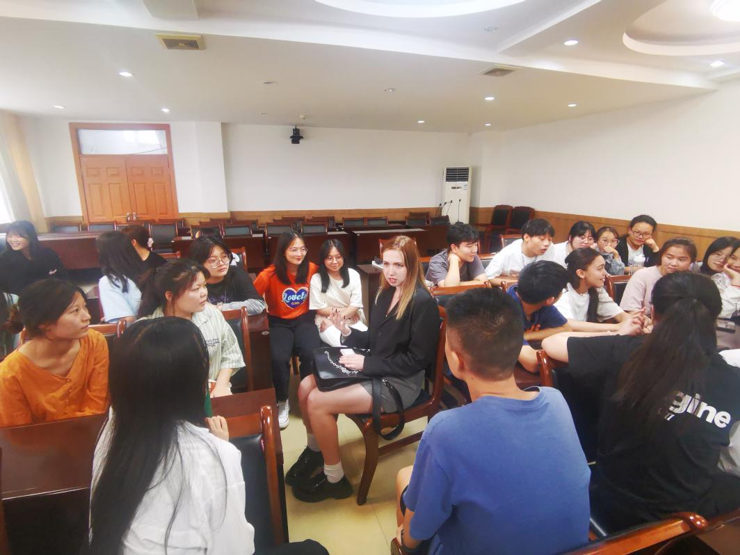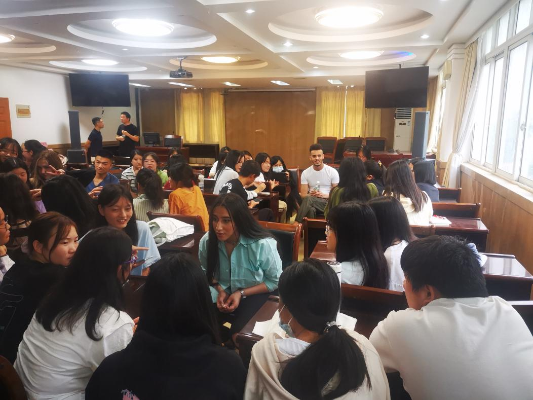 下午4:30,在培训中心二楼会议室,来自俄罗斯的Daliya,摩洛哥的Aynna、Amin和乌兹别克斯坦的Shein四位外国友人与来自21级商务英语专业的学生代表举行了一场别开生面的交流活动,学习交流、文化分享、趣味游戏,全程气氛生动、活泼,欢声笑语接连不断,外国友人和学生都享受在其乐融融的浓厚氛围当中。