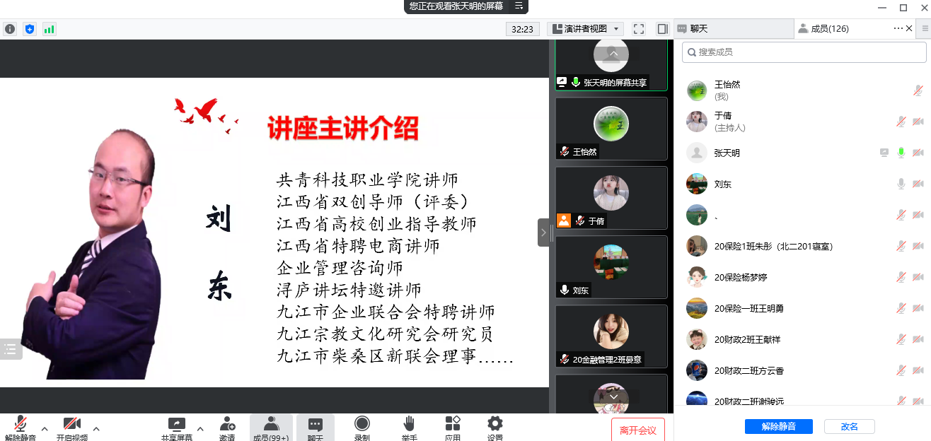学院邀请了江西省双创导师(评委)、共青科技职业学院讲师刘东作《点燃创业梦想,创新永无止境》在线讲座,培训提升毕业生创新思维,点燃创业梦想。刘东老师引用淘宝、抖音、星巴克、共享单车、共享雨伞、商业模式、九大行业等大量案例,帮助毕业生找寻创业机会,实施精准创业,激扬青春梦想。在就业创业领域及思路的问答中,刘东老师与毕业生进行了良好的互动,有效帮助毕业生厘清创业的关键步骤和痛点。
