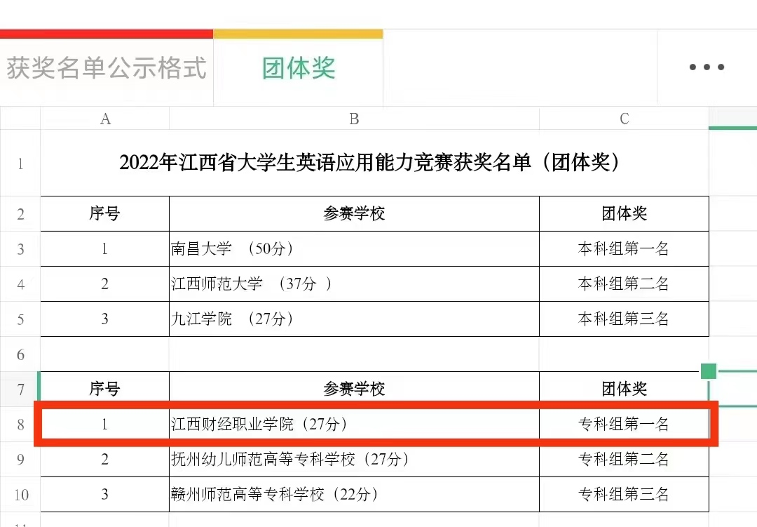 日前,省教育厅网站正式公布了2022年江西省大学生英语应用能力竞赛获奖名单。根据团体总分的积分规则,beat365凭借一等奖2项,二等奖1项,三等奖1项的好成绩,共获得团体总分27分,位列全省专科组第一名。