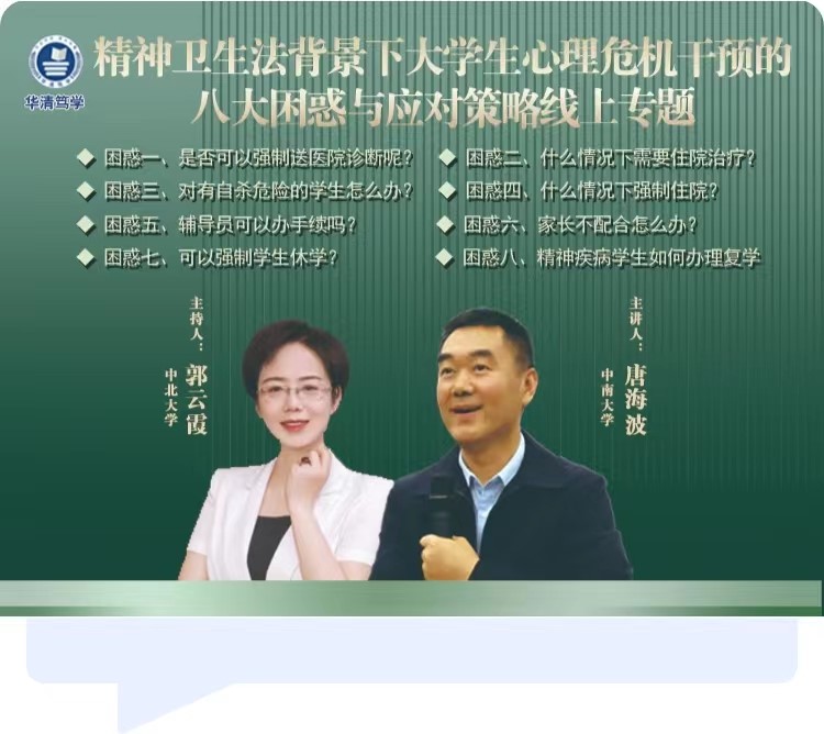 讲座中,唐海波教授从“送院诊断、住院治疗、自杀风险、手续办理、家长工作”等八个方面,结合2018年修正的《中华人民共和国精神卫生法》,强调了班主任、辅导员在大学生心理危机干预中的重要性,并通过解析近年来高校中发生的心理问题学生的典型案例,将《精神卫生法》与高校学生工作相关的条款进行了逐条、全面和深刻的解读。尤其是对实际工作中出现的难点问题,诸如大学生心理危机应急处置、心理问题学生复学评估给出了清晰详细的分析和应对策略。