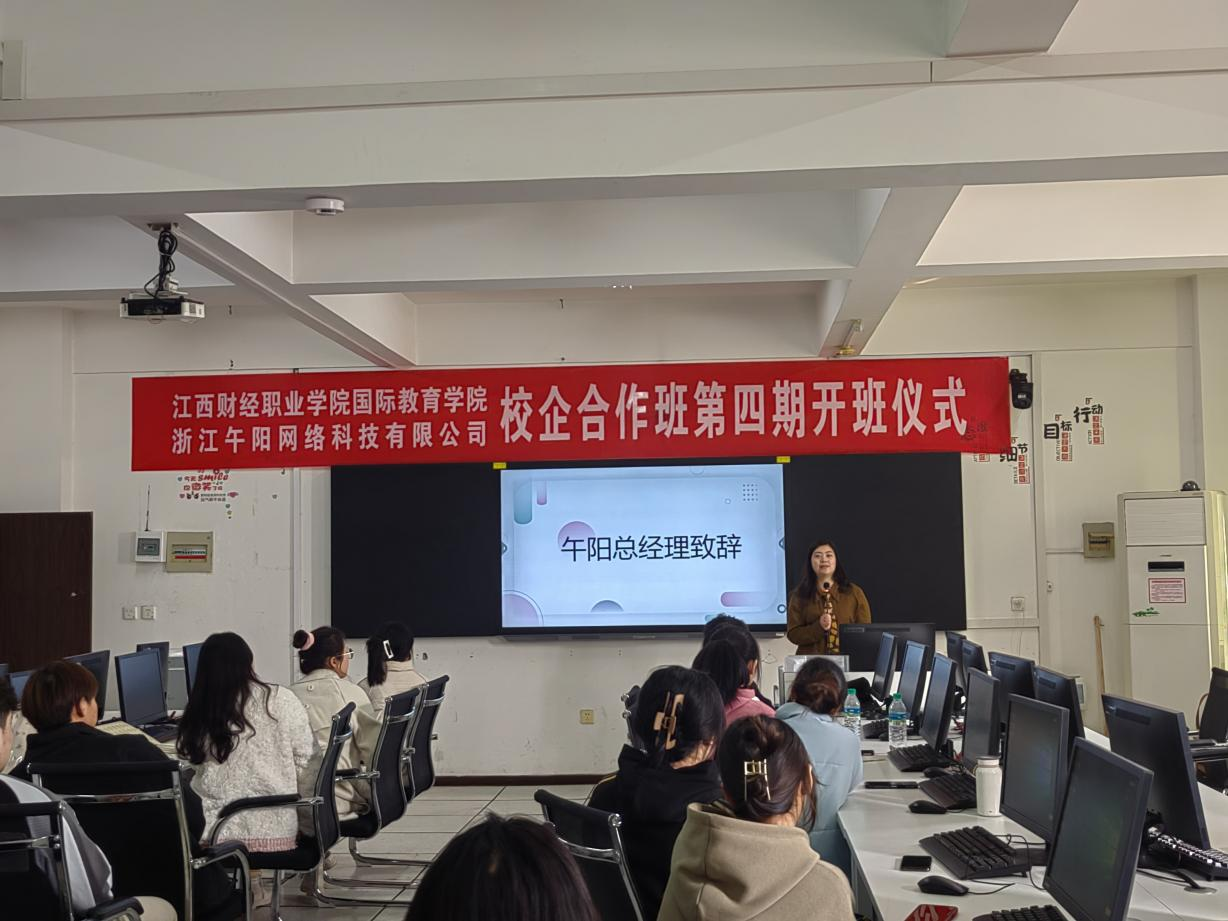 2月20日下午,国际教育学院与浙江午阳网络科技有限公司合作开设的跨境电商班第四期开班仪式在综合楼401教室举行,浙江午阳网络科技有限公司总经理熊亚丽,运营总监姚木兰,国际教育学院领导班子、以及部分指导教师和合作班全体同参加了开班仪式。