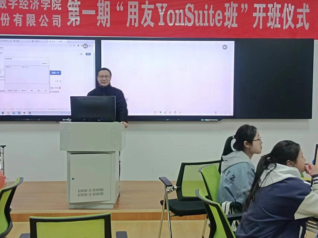 “用友YouSuite班”开设企业信息系统认知,供应链信息系统实施、管理信息系统客户化实施、实施方法论与项目综合实训、YonSuite云平台、YonSuite业财税档综合智能实训等8门课程,教学时长约11周,由用友公司北京总部桑大勇博士等企业专家来学校与beat365教师共同授课。