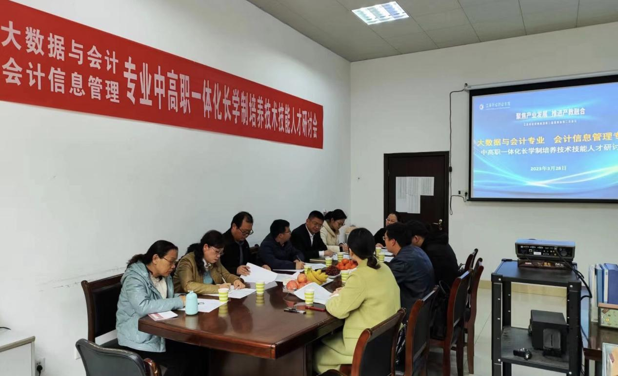 为加强中高职衔接,畅通人才成长渠道,全面提升高素质技术技能人才培养质量,3月28日下午,会计学院组织对口专业中职院校开展中高职一体化长学制培养技术技能人才研讨会。来自赣州应用技术职业学院、贵溪市职业中学、江西省井冈山经贸学校和彭泽县旅游工业中等专科学校的领导老师和会计学院教学领导班子齐聚一堂,共同就“中高职一体化人才培养以及大数据与会计、会计信息管理两个专业的课程体系设计”进行交流研讨。