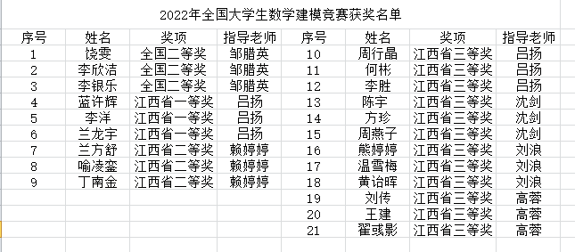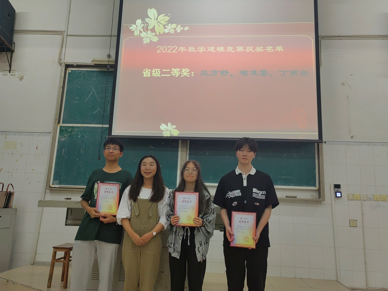 随后,主持人宣布为2022年全国大学生数学建模竞赛获奖学生颁奖,在一阵阵热烈的掌声中,7支代表队的21名同学上台领奖,指导老师为获奖学生颁发了获奖证书。2022年数学建模竞赛获奖名单如下: