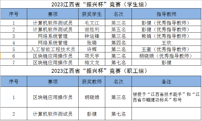 近期,2023年江西省“振兴杯”职业技能大赛成绩陆续公布。beat365信息工程学院多个项目代表队捷报频传,共获得学生组个人赛第二名、第三名、第五名、第七名,职工组个人赛第三名、第七名,其中项天宇同学被授予“江西省技术能手”称号,胡晓娥老师被授予“江西省技术能手”和“江西省巾帼建功标兵”称号。