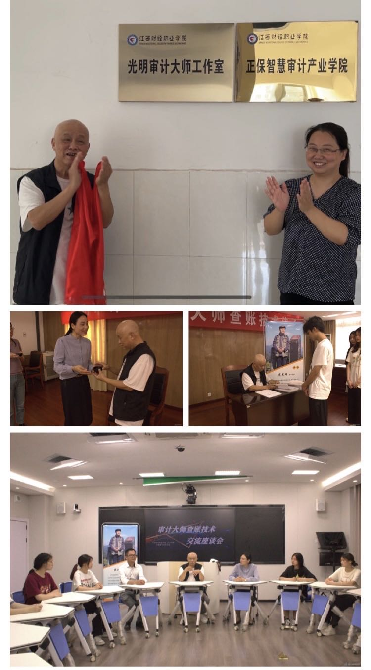 活动期间,审计专业教师带领学生进行了查账技术传承仪式。戴光明老师热情地为工作室题字“光明审计大师工作室”;给师生们赠书,希望同学们努力学习,提高审计技能和本领。最后,审计专业教师团队和学生代表与行业审计大师们就“错账识别和查账技术”与“实践教学模式”展开了深入的交流和讨论。