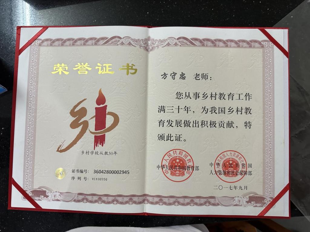 “我所做的都是些平凡的事情,要说比较自豪的是这么多年过去了,无论当年成绩好的还是成绩差的学生也都还记得我”。退役后,方守忠先在江西共产主义劳动大学工作,后听从组织安排,返回家乡,在江西省九江市都昌县三汊港镇亮星村小学任教。乡村小学,最大的困难就是师资匮乏,为此,方守忠一人就担着三个年级的教学任务,常常是这节课刚给一年级上完,下节课立马接着给三年级上,学校里连轴转。成家后,方守忠为了添补家用,下课后还得立马赶到地里干农活,变成了学校里家里一起连轴转。就这样忙忙碌碌,勤勤恳恳,方守忠“一支粉笔、两袖清风、三尺讲台、四季耕耘”,在乡村教师的岗位上一干就是37年。37年来,他为一批又一批孩子铺好了走出山村的路,改变了无数人的命运。