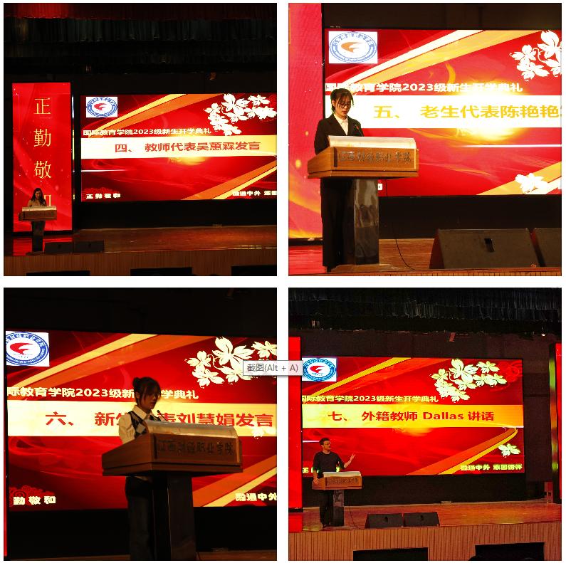 教师代表商务英语教研室主任吴蕙霖老师致新生寄语,期望新生学好专业知识,塑造人格品质,提升综合技能,培养全球视野,成为具有国际竞争力的商务英语精英。来自加拿大的外籍教师Dallas分享了自己学习英语的经历,鼓励同学们积极地学习语言,引导大家快乐地适应大学生活,勇于挑战自己。21级商务英语2班陈艳艳代表老生发言,她分享自己的大学生活经历和感受,建议新生们规划自己的道路,积极参与各种活动,提高综合实践能力。23级商务英语3班刘慧娟代表新生发言,她表达了对大学生活的热切期盼,希望和大家一起努力,勇敢地去追求自己所热爱的东西,在奋斗中进步。