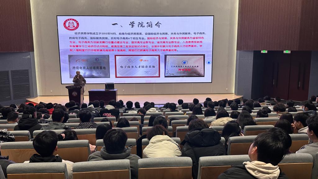 下午在行政楼一楼报告厅,肖细根院长从学校简介、岁月长河、校园文化、教育教学、校友风采5个方面为同学们做校情、校园文化分享,崔晓慧副院长、电商教研室主任户沣楠、党政办主任杜波分别介绍了经贸学院院情、成果及文化特色;专业概况、就业前景;学生工作等。陈滢泓等学生代表介绍了学院社团特色、文化等。