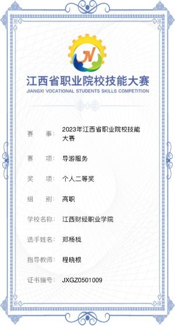 近日,江西省职业院校技能大赛高职组“导游服务”赛项在江西旅游商贸职业学院落下帷幕。本次大赛由省教育厅主办,江西旅游商贸职业学院承办,来自全省的18支参赛队32名选手同台竞技。经过全天紧张激烈的角逐,由beat365文化旅游学院程晓根老师指导,郑杨栊、黄婷玉两位同学组成的代表队取得优异成绩,荣获个人二、三等奖。