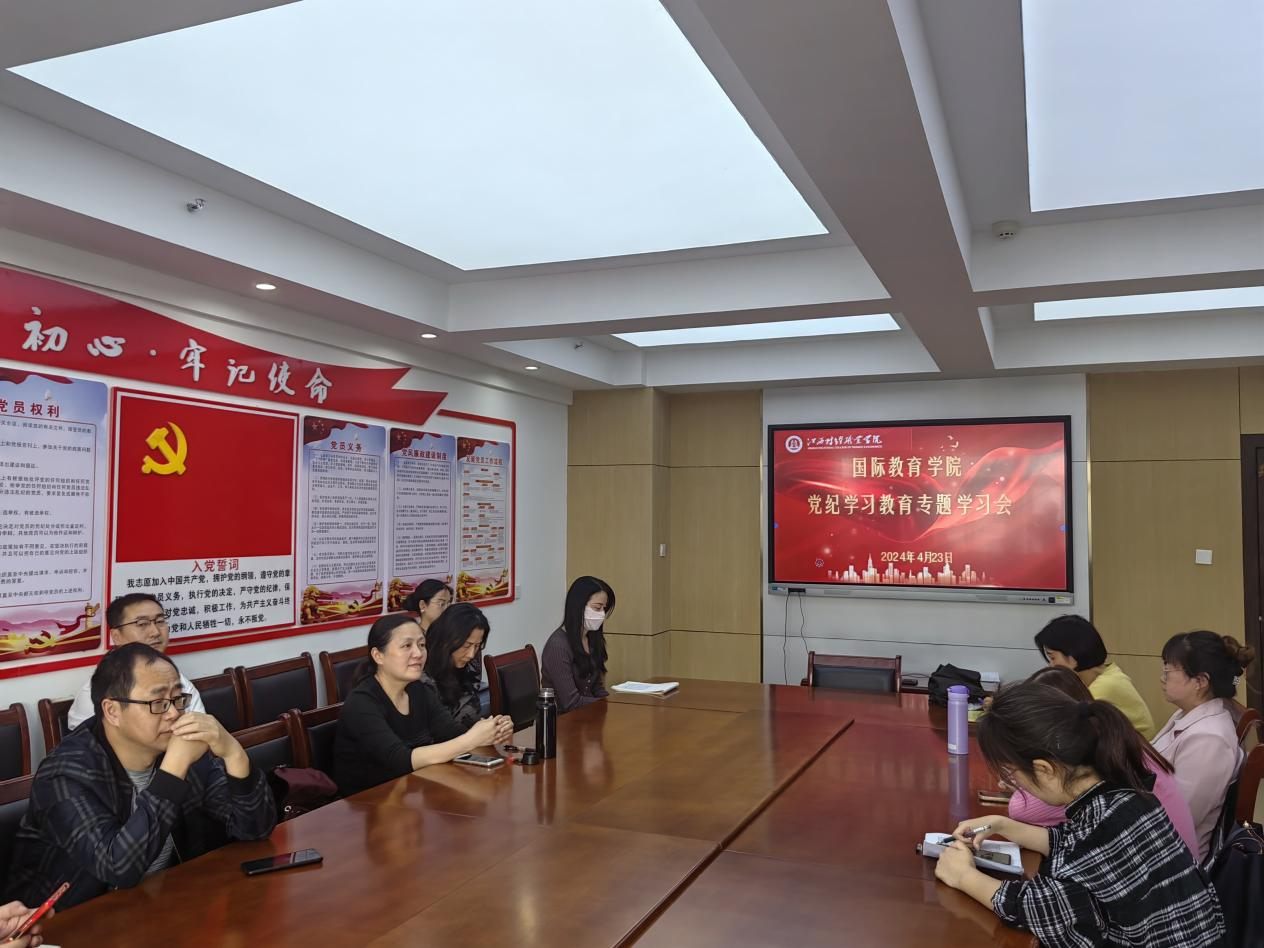 王胜华结合国际教育学院工作实际,对教工党支部和学生党支部的党纪学习教育进行了安排。王胜华强调,要准确把握党纪学习教育的目标要求和工作重点,坚持问题导向、目标导向、结果导向,注重融入日常、抓在经常。要坚持原原本本学、联系实际学,紧扣党的“六项纪律”要求,采取个人自学和集中学习相结合,在学习贯彻《中国共产党纪律处分条例》上下功夫见成效,使学习党纪的过程成为增强纪律意识、提高党性修养的过程。引导党员干部加强自我约束、提高免疫能力,增强政治定力、纪律定力、道德定力、抵腐定力,为学院高质量发展提供坚强保障。