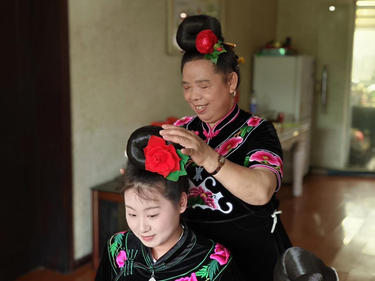 “这是我们苗族的传统,如果你从远方来,那么我一定要招待你到家里喝酒” 我们很好奇她的普通话为什么这么好,原来她曾经当过凯里周边6个自然行政村的医生。行医的岁月里,她亲历着地区普通话推广得越来越好。现在凯里鸭塘镇大多数自然村都能无障碍交流了,“当然了,我们讲话的口音还是有点改不掉。说得不好,说得不好。”她爽朗地笑着。她还给我们团队的小姑娘盘起了苗族发髻,一遍遍梳着都是满满的祝愿。“真好啊,妹妹们,推广了普通话让你们来我家里做客啊。”