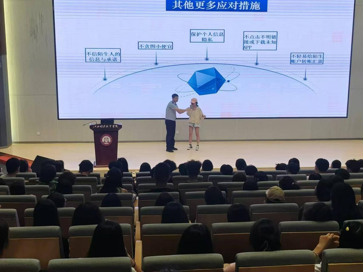 活动现场陈警官用通俗易懂的语言结合具体案例,采取以案讲法、以案学法的方式,深入剖析大学生群体最容易受骗的诈骗类型和作案手法,向同学们传授防范“秘籍”。用有奖问答的形式同学生们一起学习《反电诈法》《反有组织犯罪法》的法律法规,让同学们知法、守法。陈警官从多方面描述各类诈骗手段和防范技巧,为校园反诈知识“划重点”;送上最强反诈“开学指南”,还积极引导师生们主动发挥宣传辐射作用,鼓励他们争做“反诈”宣传员,把学到的知识分享给家人和朋友,共同构筑反诈“安全墙”。
